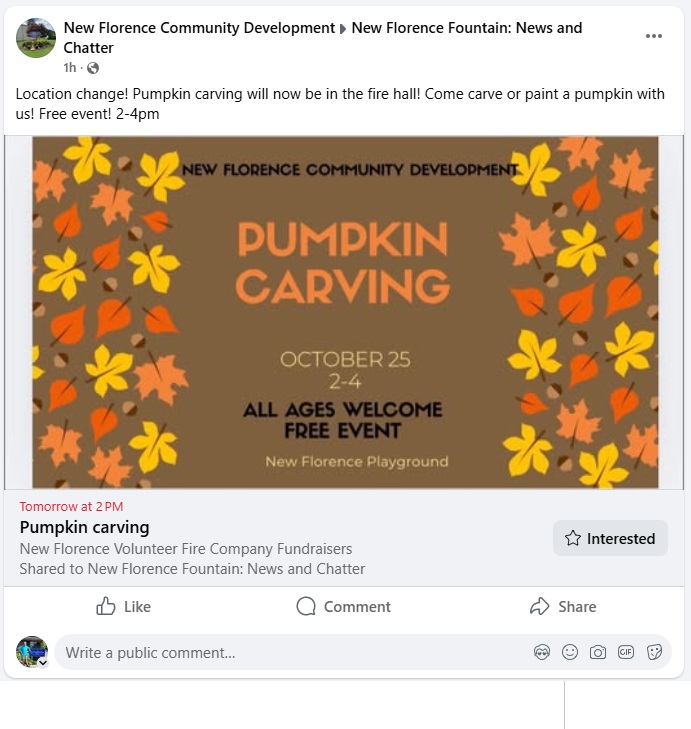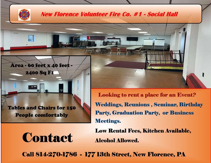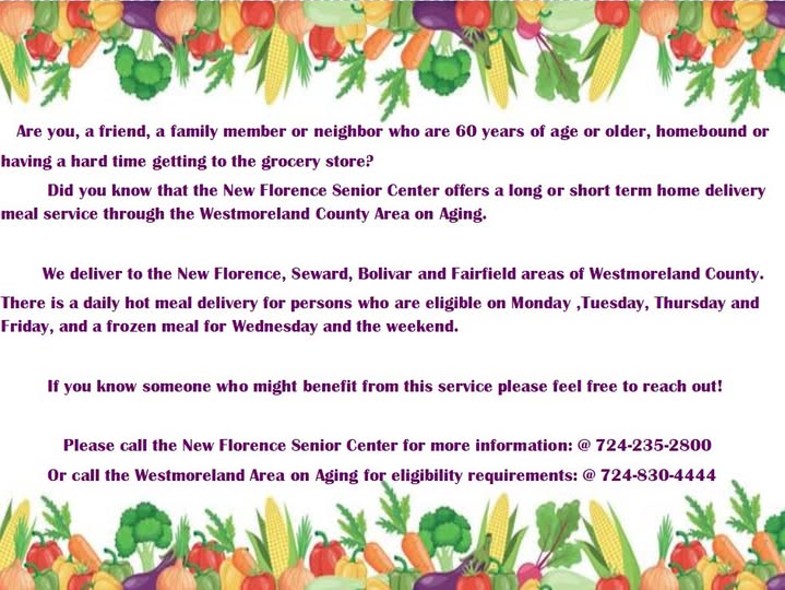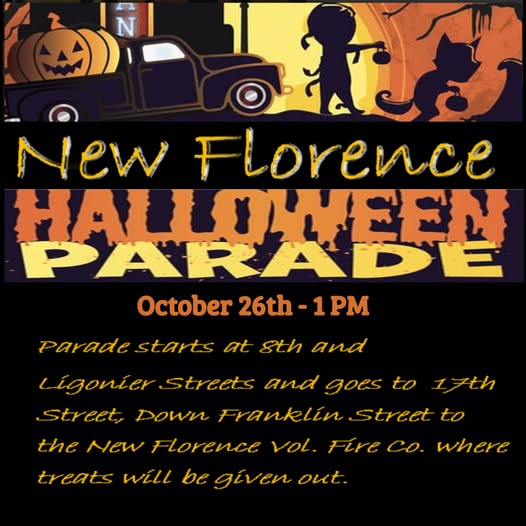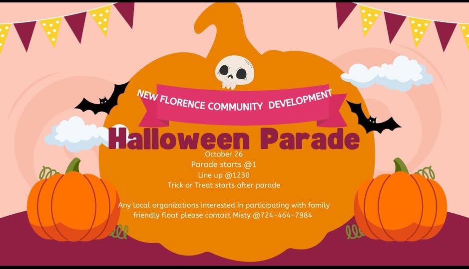 Here are some updates for the website. First, here is the AGENDA 10-21-25 for the upcoming borough council meeting. There were also two special borough council meetings held earlier this month, mostly dealing with time-sensitive contracts. Here are the agendas for those meetings. AGENDA 10-07-25 and AGENDA 10-16-25 Pending. Notices of the meetings were published in the Johnstown Tribune Democrat newspaper. The council also published a notice accepting applications for the position of Borough Solicitor. Attorney Daniel J. Hewitt is retiring. We wish him well in his new adventures. Next, the New Florence Senior Center has their November 2025 Calendar published. The calendar has all the meals listed for the month. The meals have a suggested donation of $2.00 if over 60 years of age and $3.97 if under the age of 60. Please call the center a week prior to make sure enough meals are ordered. If you have any questions, please call 724-235-2800. Finally, the New Florence Community Development has their Pumpkin Carving event on October 25 at the playground and the Halloween Parade with Trick or Treating on Sunday October 26th. And remember, treats will be passed out in the fire hall after the parade. It will be a busy weekend for sure. Please see the flyers below for more information. Thanks.