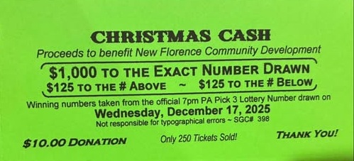 Here are some updates for the website. First, here is the AGENDA 11-18-25 for the upcoming borough council meeting this week. Next, the New Florence Community Development is selling a “Christmas Cash” raffle ticket that’s drawn on December 17th. You can contact a member through their Facebook page to purchase tickets. You can also email the group at ContactNFCD@gmail.com. Or give Misty a call at 724-464-7954. Finally, on December 14th there will be the 5th Annual “Festivus For The Rest Of Us 5K Race”. Dean Banko, with the help of the New Florence Volunteer Fire Department, puts together this crazy event. The race itself is a fun holiday themed race based off the idea of Festivis from the TV show Seinfeld. Very detailed information on the race can be found at New Florence Festivus 5K Race. Keep in mind the deadline for ordering a T-shirt is November 23rd at 6pm. Please see the flyers below or the Event Calendar for more information on these great activities.