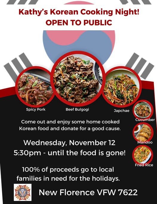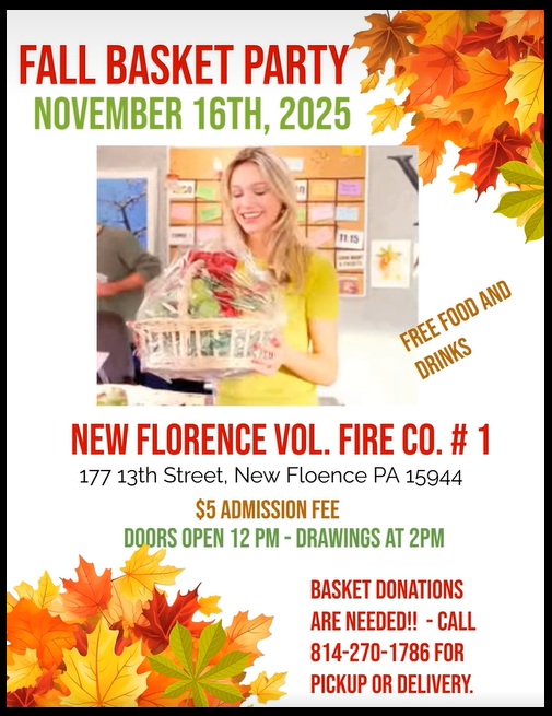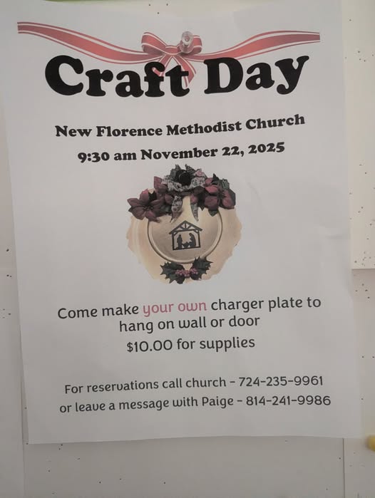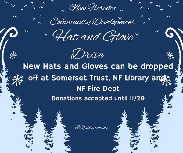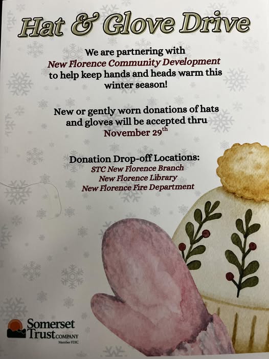Here are some updates to the website. First. Chief Patrick M. Goggin of the St. Clair Township Police Department provided the Police Report – October 2025 for the website. After that, the New Florence Community Development group along with The Somerset Trust are doing a hat and glove drive until November 29th. Please donate if you can. Next, the New Florence Volunteer Fire Department is looking for donations for their Fall Basket Party on November 16th. Help if you can by donating a basket. Then the New Florence VFW Post 7622 is having another Kathy’s Korean Cooking Night on November 12th. This event is open to the public with 100% of the proceeds going to local families in need for the holidays. The club has done this in the past, and I’ve heard the food was amazing. Finally, the New Florence Methodist Church is hosting a Craft Day on November 22nd. Please see the flyers below for more information on all these events. Thanks.