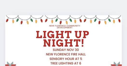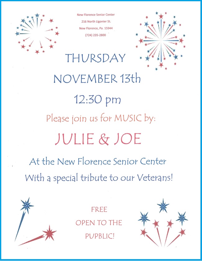 Here are quite a few updates to the website. First, don’t forget to go and vote tomorrow. The New Florence Community Library will be having their traditional Election Day Bake Sale starting at 8 am at the fire hall. The library will also have a guest speaker, Ed Kelemen, on November 8th who is a local author and paranormal documentarian. The library also has a lot of Christmas baskets available for purchase. Stop in and find a wonderful present for someone special. Next, the New Florence Volunteer Fire Department will be having their Fall Basket Party on November 16th. Basket donations are needed. Next, the New Florence VFW Post 7622 has set up their Angel Tree. This tree helps to fill the wishes of children in our community. Another upcoming event will be held at the New Florence Senior Center on November 13th. It will feature music by Julie & Joe with a special tribute to our Veterans. Finally, mark your calendars for November 30th. The New Florence Community Development will be hosting Light Up Night at the little park by the fire hall. Please see the flyers below for more information. Thanks.
