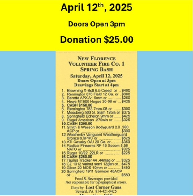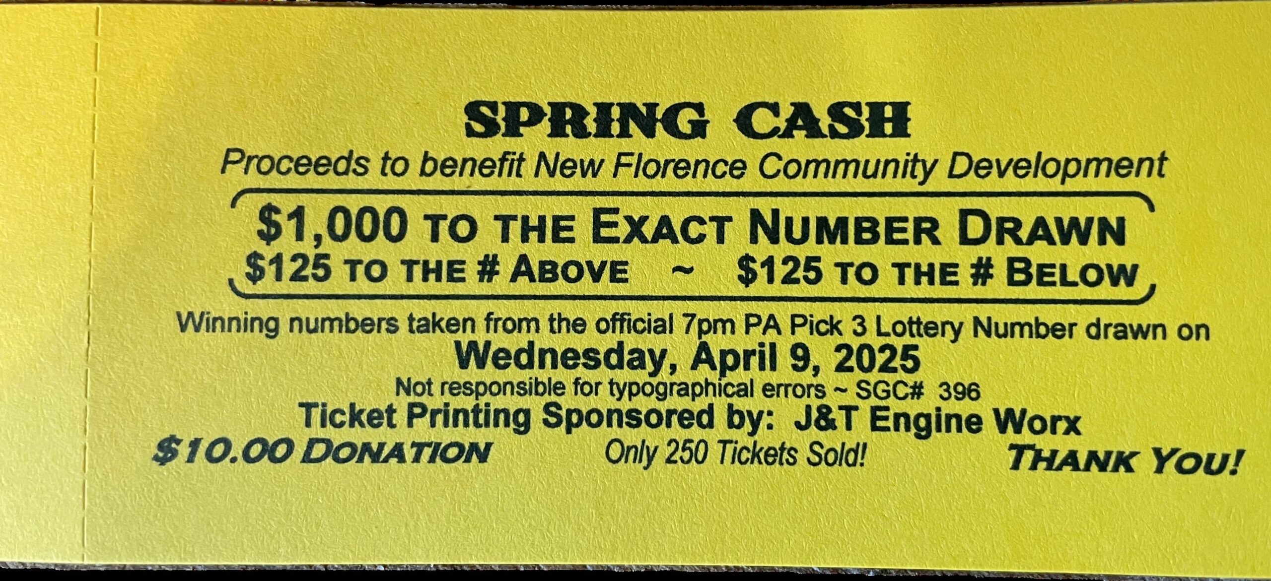 Here are a few updates to the website. First, Chief Patrick M. Goggin of the St. Clair Township Police Department provided the Police Report – February 2025 for the website. Next, the New Florence Volunteer Fire Department’s Spring Bash will be April 12th. This event has been added to the Calendar. Finally, the New Florence Community Development is selling a “Spring Cash” raffle ticket that’s drawn on April 9th. You contact a member through their Facebook page to purchase tickets. Please see the flyers below or the events on the calendar for more information. Thanks.