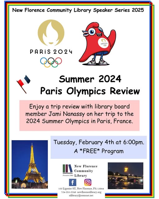 Here are quite a few updates to the website. First, here are three documents from the borough council. They are the MNUTES 12-17-2024, the MNUTES 12-23-2024, and the New Florence Borough Website Update 1 January 2025. The website update document shows a snapshot of usage of the borough’s website on 1 January 2025. Next, the New Florence/St. Clair Sanitary Authority published a notice in the Johnstown Tribune Democrat of their 2025 meeting schedule. Those meetings have been added to the Calendar. After that the New Florence Volunteer Fire Department put out an updated flyer for their next sub sale and rippie party being held on February 1st. Then the New Florence Senior Center announced they are having a basket party on March 10th. The next notice is from the Laurel Valley Little League Baseball organization. They now have open registration for the 2025 season. Finally, the New Florence Community Library has several items for the community. The first thing is the library is hosting a talk by Jami Nanassy on her trip to the 2024 Summer Olympics in Paris, France, on February 4th. Next the library is having their next Literary Escape Book Club on the 11th of February. Lastly, the library would like the community to know they have a variety of tax documents in stock. Please see the flyers below or the Calendar for more information on all these items. Thanks.