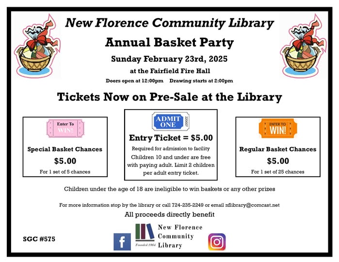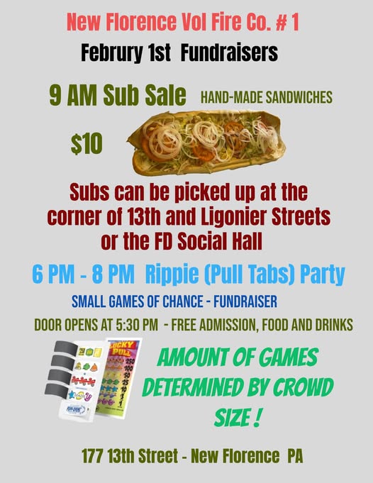 Here’s some more activities upcoming in the neighborhood. First, the New Florence Community Library is now selling tickets for their basket party on Sunday, February 23rd. Stop by the library and pick some up. Next, the New Florence Community Development organization put out a save-the-date notice of future events they will be hosting. These activities have been added to the Calendar as place holders. More information will be added as it becomes available. Then the New Florence Volunteer Fire Department announced they will be having their next sub sale and rippie party on February 1st. They also have a $500 Sheetz Gift Card fundraiser in their Square Store. Finally, the opening day of trout season and deer hunting season are major informal holidays in the state. The opening day of the trout season is April 4th. Mentored Youth Trout Day is March 29th. You can expect more traffic along area roadways next to the creeks. Please be careful driving in those areas. Please see all the flyers below or the events in the Calendar for more information. Thank you.