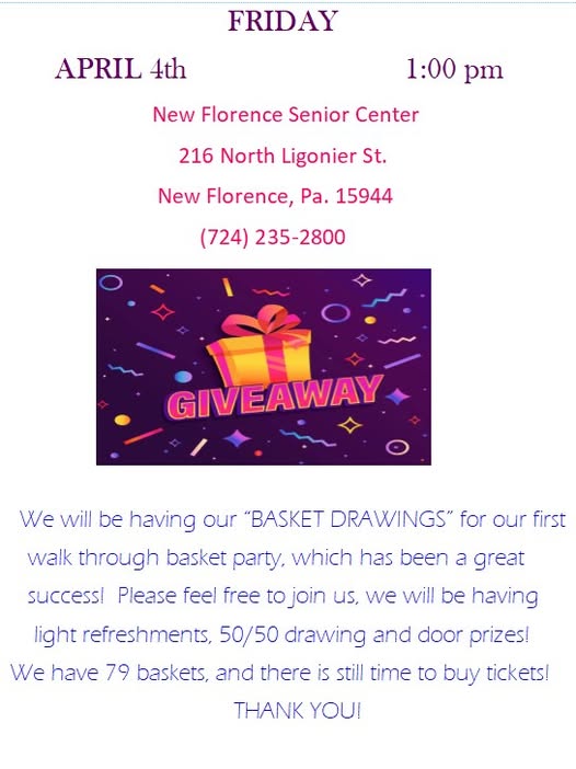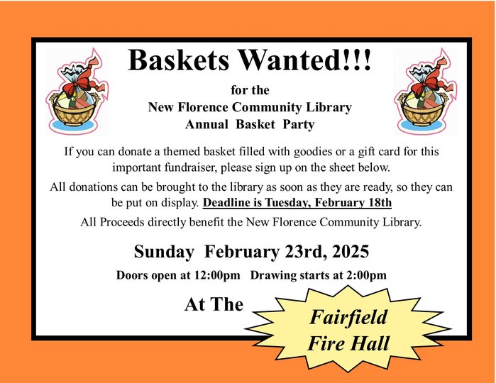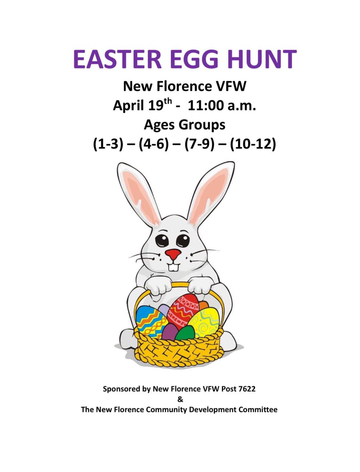 Here are some updates for the website. First, the New Florence VFW Post 7622 and the New Florence Community Development organizations will be doing a combined Easter Egg Hunt on April 19th at the VFW. The VFW is collecting candy donations to fill the Easter Eggs. Please drop off any donations by April 12th. They also need volunteers to help fill the eggs on April 16th at 6 pm. Next, the New Florence Community Library will be having another Literary Escape Book Club meeting on April 8th. Finally, the New Florence Senior Center is in the middle of their walk-in basket party. The winning numbers will be drawn on April 4th. Anyone can stop now, look over the baskets, get some tickets, and take a chance on winning. Please look at the flyers below and the basket party photos to learn more information. Cheers, Greg