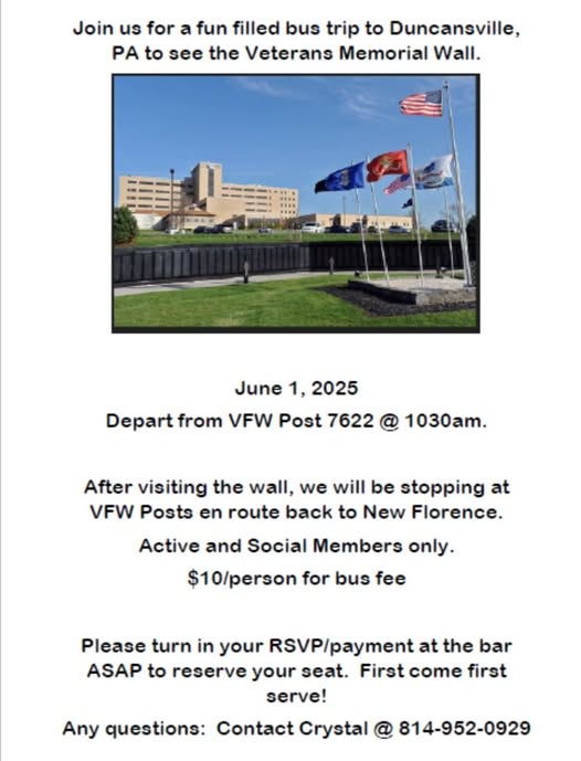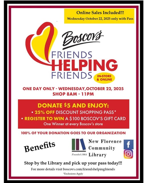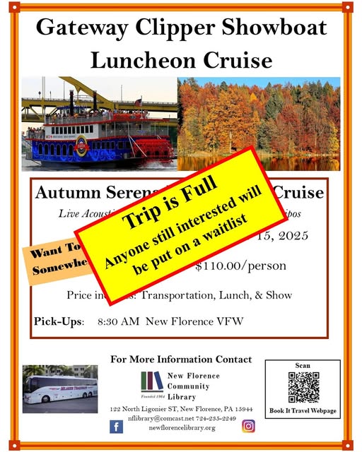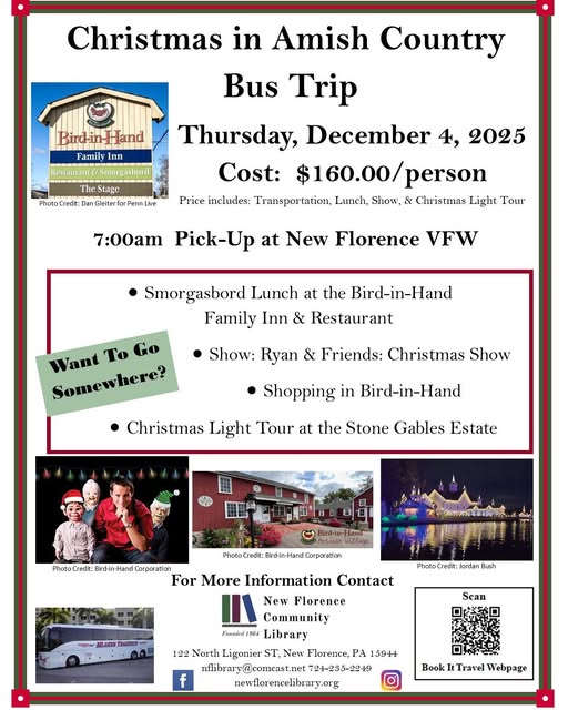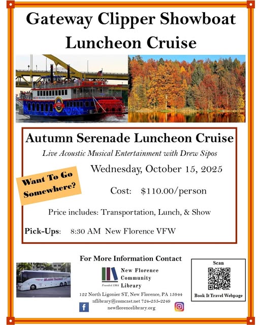 Good morning! Here are more updates for the website. First, here are the minutes of the September borough council meeting MINUTES 09-16-25 and the two special borough council meetings held earlier this month. MINUTES 10-7-25 and MINUTES 10-16-25 These meetings dealt mostly with renewing the police contract. Please take a few minutes to read the minutes. Next, the New Florence Volunteer Fire Department will be having their November sub sale and rippie party on November 1st. The New Florence VFW Post 7622 has quite a few upcoming events. There is a Halloween Dance on October 31st, a Turkey Raffle on November 6th, and then a Veterans Day celebration and breakfast on November 11th at 10 am. Remember, Veterans Day honors those who hung up their uniform. Finally, the New Florence Community Library is doing another bus trip. This is a Christmas in Amish Country trip on December 4th. Everyone had a great time on the Gateway Clipper Cruise bus trip. Please see the flyers below for more information. Thanks.