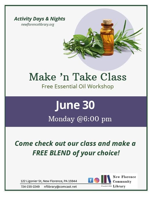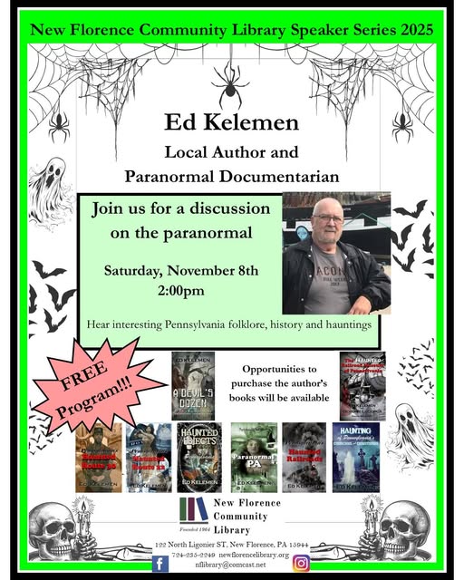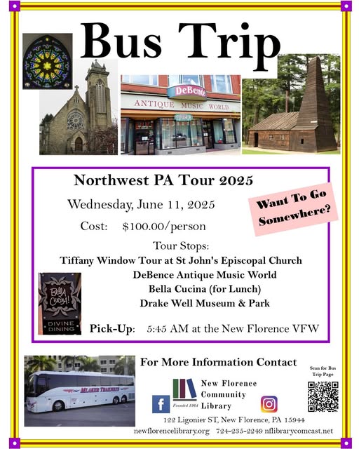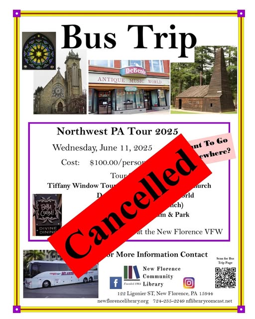 Just a quick update for the website. The New Florence Community Library cancelled their northwest PA bus trip for June 11th. The library will be contacting those who signed up. Sorry.