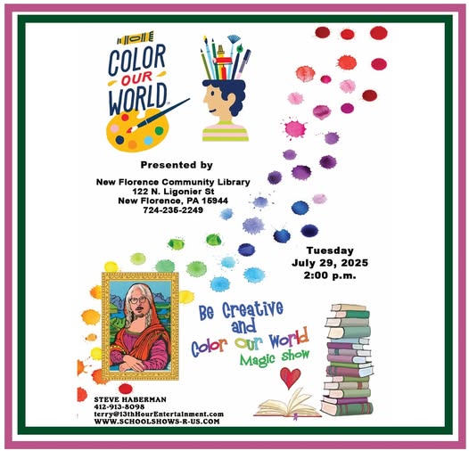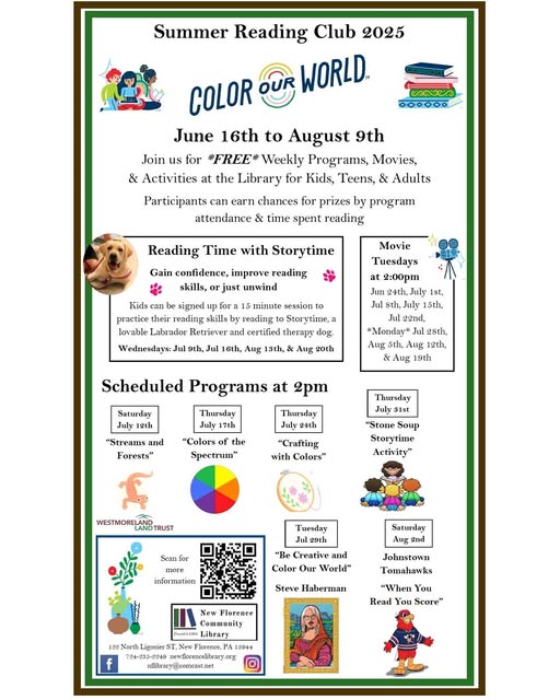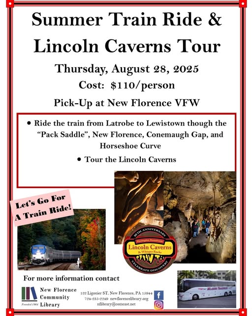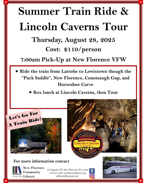 There are a bunch of updates to the website. Holiday festivities and a crazy work schedule means I’m behind on getting information posted. Sorry! First off, at the 30 June 2025 borough council meeting Todd Hepner was sworn in as a council member. He is replacing Mason Luther who moved out of New Florence. The minutes for the May council meeting were also approved. MINUTES 05-19-25 Next, Chief Patrick M. Goggin of the St. Clair Township Police Department provided the Police Report – June 2025 for the website. After that the New Florence Volunteer Fire Department will be having their July sub sale and rippie party this weekend. These were delayed a week from their normal first Saturday of the month so everyone could have a wonderful and safe Fourth of July. The New Florence Community Development organization announced the dates for their yearly Back to School event and the Craft and Vendor Fair events as place holders. More information to follow soon. Did you know the New Florence Senior Center offers a long- or short-term home delivery meal service? Contact the center for more information. Finally, the New Florence Community Library has a lot of upcoming events. On Saturday, July 12th, the Westmoreland Land Trust will do a presentation on “Streams and Forests”. The library is also going to do another train ride trip. The event is the “Summer Train Ride & Lincoln Caverns Tour” adventure. As one who went on their Fall Foliage Day Trip train ride in October 2023, we had a blast. This trip sounds even more exciting. Please see all the flyers below for more information. Thanks.