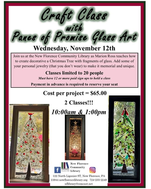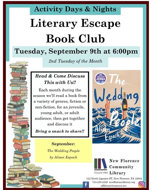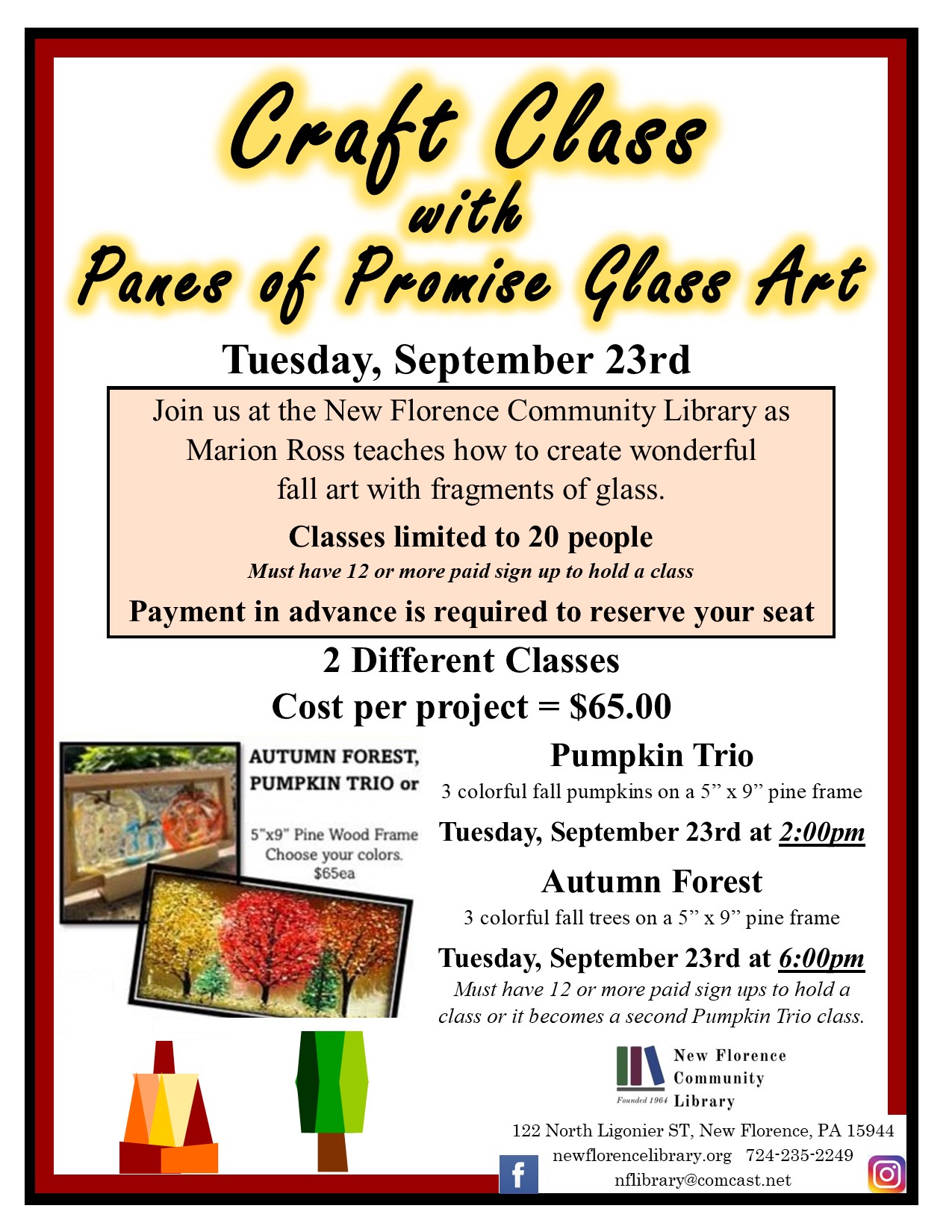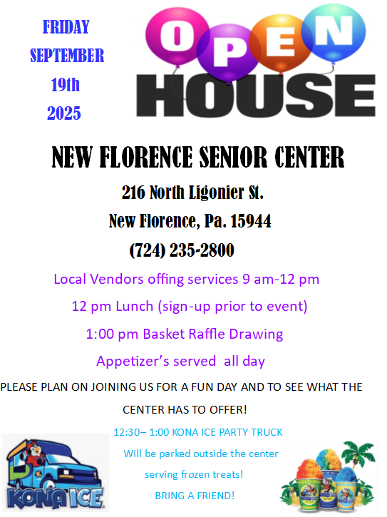 September is going to be a busy month in the borough. There are lots of activities planned. But first, please be aware Monday, August 25th, is the first day of school for the Ligonier Valley School District. Keep an eye out for all the school buses. I think unofficially summer’s over! Shown below is the school calendar. Also, here is a pdf of the calendar. Ligonier Valley School District 2025-2026 Instructional Calendar Here are the minutes from July’s borough council meeting. MINUTES 07-15-25. After that, the New Florence Community Library will hold a Literary Escape Book Club on September 9th to discuss Alison Espach’s, The Wedding People, book. The library will also have a Craft Class with Panes of Promise Glass Art on September 23rd. There will be two classes where participants can make a framed picture using fragments of glass. Next, the New Florence Senior Center is holding an Open House on September 19th with lots of great activities. I attended last year’s Open House and it was very nice. The center is also having a Special Bingo on Saturday, September 27th. Finally, the New Florence Community Development organization would like to remind everyone of the Craft and Vendor Fair on September 28th. For more information, please see the flyers below or the Event Calendar. Thanks.