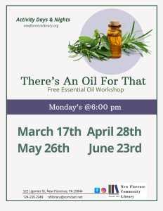 Here are some additions to the website. First, here are the minutes from the March borough council meeting. MINUTES 03-18-25 After that, the New Florence Volunteer Fire Department will be having their next sub sale and rippie party on May 3rd. They also want to remind folks they will be holding their Spring Basket Party on May 18th. Next the New Florence Community Library has lots of upcoming and ongoing activities. There are monthly activities for kids, teens, and adults. In May the Literary Escape Book Club will be discussing C. S. Lewis’s The Lion, the Witch and the Wardrobe from the Chronicles of Narnia. The library also has several Essential Oils workshops planned for the next couple of months. Finally, the New Florence VFW Post 7622 will be hosting a bus trip to the Veterans Memorial Wall in Duncansville, PA, on June 1st. Please see the flyers below or the Calendar for more information on all these events. Thank you.