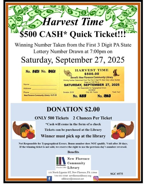 Here are a few updates for the website. First, Jeremy Auker and family will be back for another produce sale on August 28th starting at 5 pm. They will set up next to the post office at Bowers Mini-Storage. Next, the New Florence Community Library has a raffle ticket fundraiser, “Harvest Time”, for $500 cash that’s drawn on Saturday, September 27th, 2025. Finally, for a little bit of housekeeping, here is Resolution 1 of 2025, Appointment of Todd Hepner to Borough Council. For more information, please see the flyers below or the Event Calendar. Thanks.