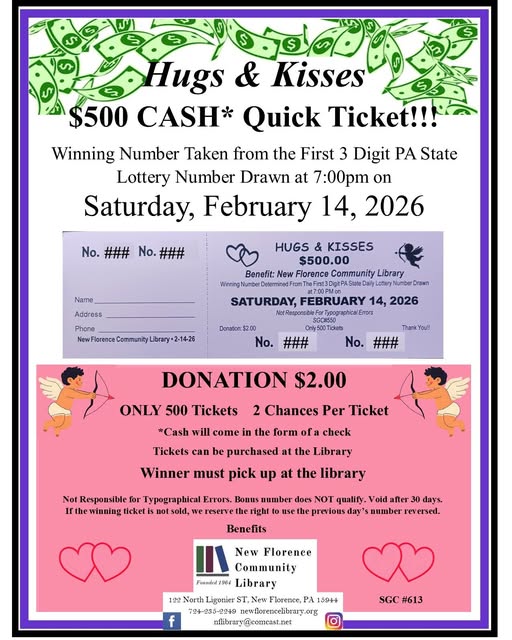 Here are a couple of updates for the website. The New Florence Community Library is doing another raffle ticket fundraiser. It is “Hugs & Kisses” $500 CASH* Quick Ticket!!! which goes off on February 14th, 2026. The library has their first Literary Escape Book Club meeting of the year on January 13th to discuss Marie Benedict’s, Queens of Crime, novel. Next, on Monday, December 22nd, the New Florence Lions Club presented Laurel Valley Elementary School with money towards their student needs fund. The fund is used for anything from a coat to school supplies for students in need. This is one of the many projects the Lions Club is involved with. In the picture on the right Principal Brett Marlboro, Lions Dale Counihan, Homer Lewis, school nurse Kayla Daugherty, King Lion Ryan King, Lions members Todd Hepner and Ricky Davis. The Lions Club thanks all who support them in their efforts and looks forward to seeing everyone in 2026. Please see the flyers and photo below. Thanks.