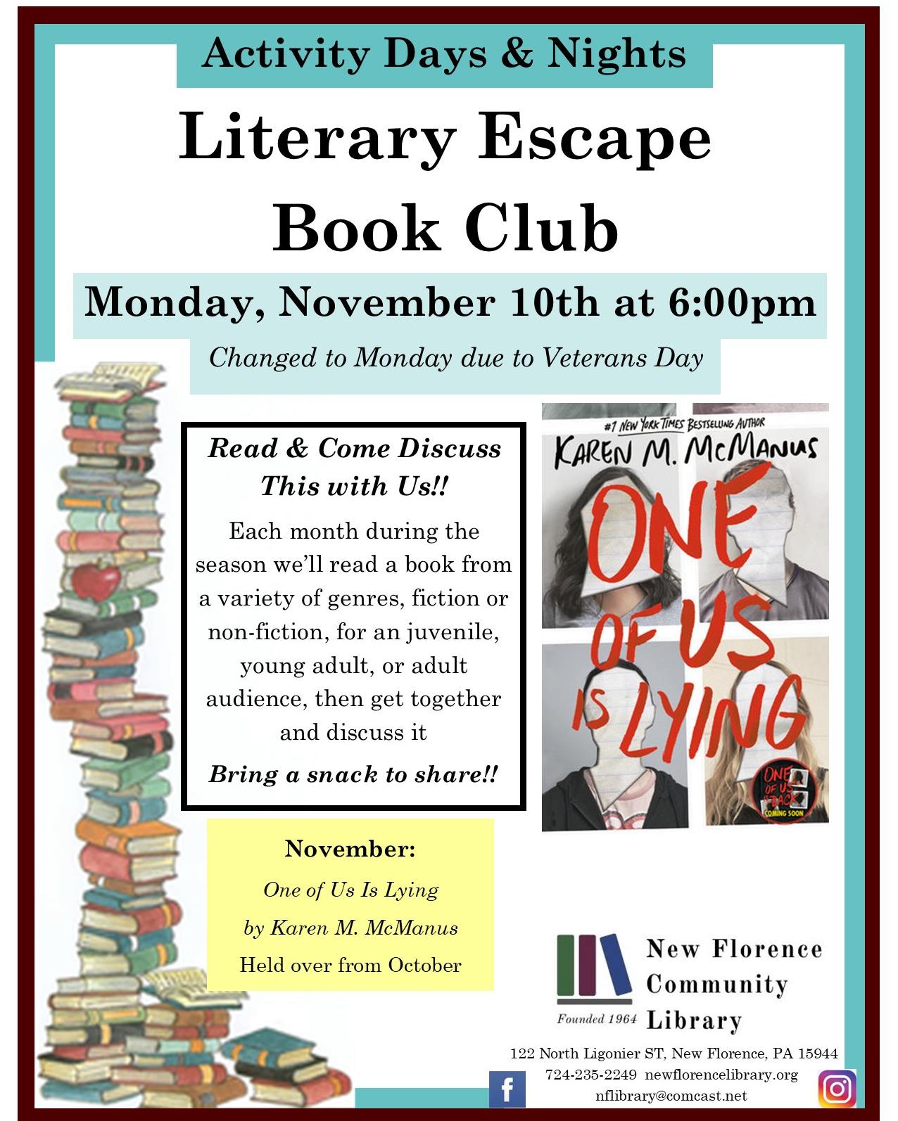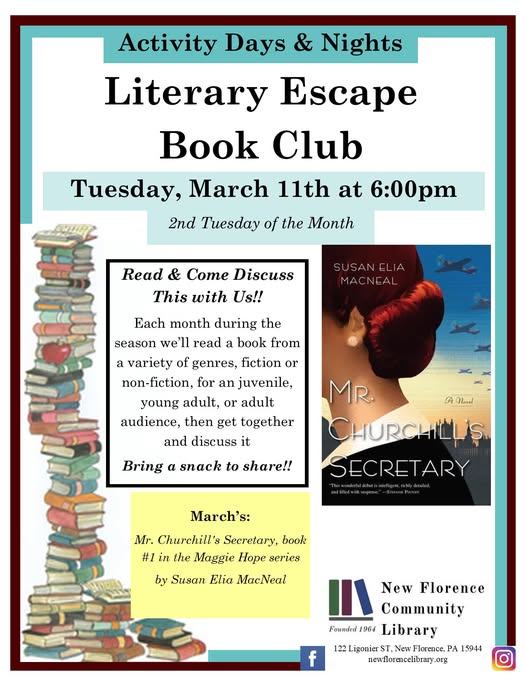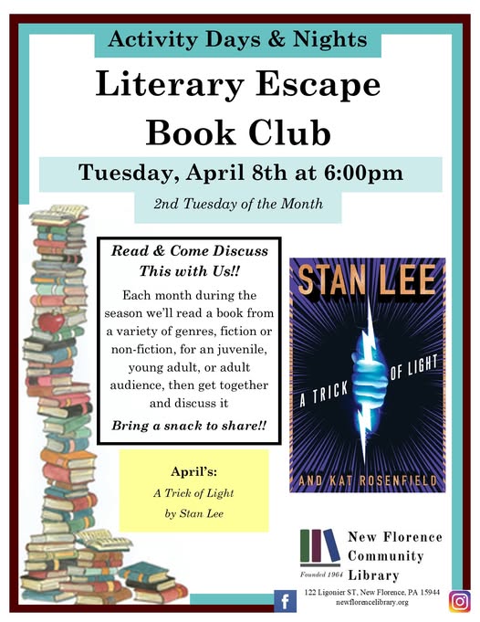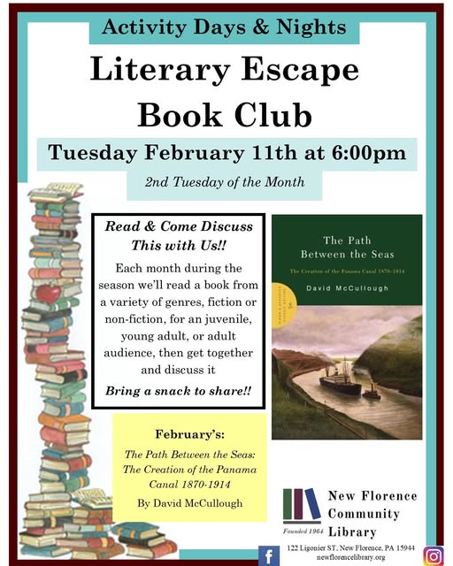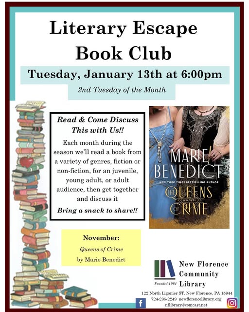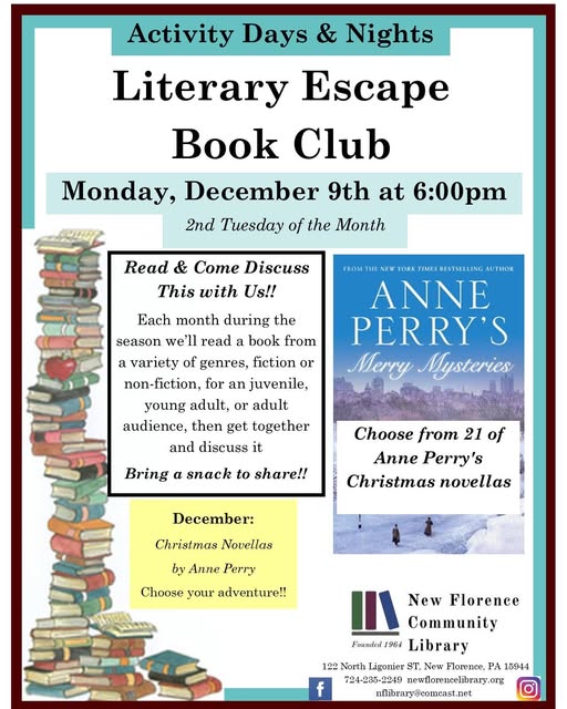 Here are some updates for the website. First. Chief Patrick M. Goggin of the St. Clair Township Police Department provided the Police Report – November 2025 for the website. After that, the New Florence Community Development group would like to thank all those that came out for Light Up Night on November 30th. The lights look wonderful at the corner and the kids enjoyed visiting Santa and Mrs. Claus at the fire hall. Next, the New Florence Community Library will be holding another Literary Escape Book Club meeting on December 9th. The library would also like to remind folks during bad weather to please call first to ensure they are open. If the weather’s bad, the library will close to keep employees and patrons safe. Please see the flyers below or the Event Calendar for more information on these wonderful activities. Thanks.