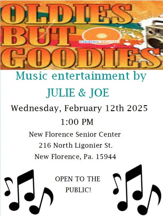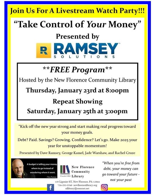 So, the first bunch of updates for the website were all the administrative stuff getting the new year started. Now here’s a bunch of upcoming activities to enjoy. First, the New Florence Community Library has several events going on. The first thing the library is doing is hosting two livestream watch parties on “Take Control of Your Money” on January 23rd with a repeat broadcast on January 25. Learn how to take control of your finances with this free seminar. The library also put out a notice for their annual basket party which will be February 23rd at the Fairfield Fire Hall. Please save the date and consider donating a basket for the party. Next, the New Florence Senior Center announced they are having a musical event, “Oldies But Goodies”, on February 12th at 1 pm. This event is open to the public and should be a lot of fun. After that, the New Florence VFW Post 7622 is having a “Great Chili Cook Off 2025” on Super Bowl Sunday, February 9th. I guess we’ll know after tonight if the Steelers are still in the running for the playoffs. Finally, the New Florence Community Development put out preliminary information for their fall Craft and Vendor Show on Sunday, September 28th. The group has put out a “Calling all Vendors” request for those who might want to register for the show. The group also has monthly meetings on the first Tuesday of each month at 6 pm at the borough building. These meetings are open to the public and all are welcome to attend. Please see the flyers below or the events on the calendar for more information. Thanks.