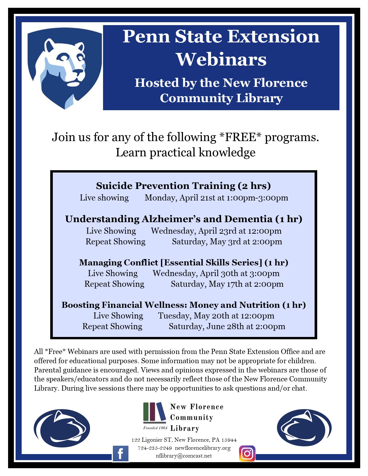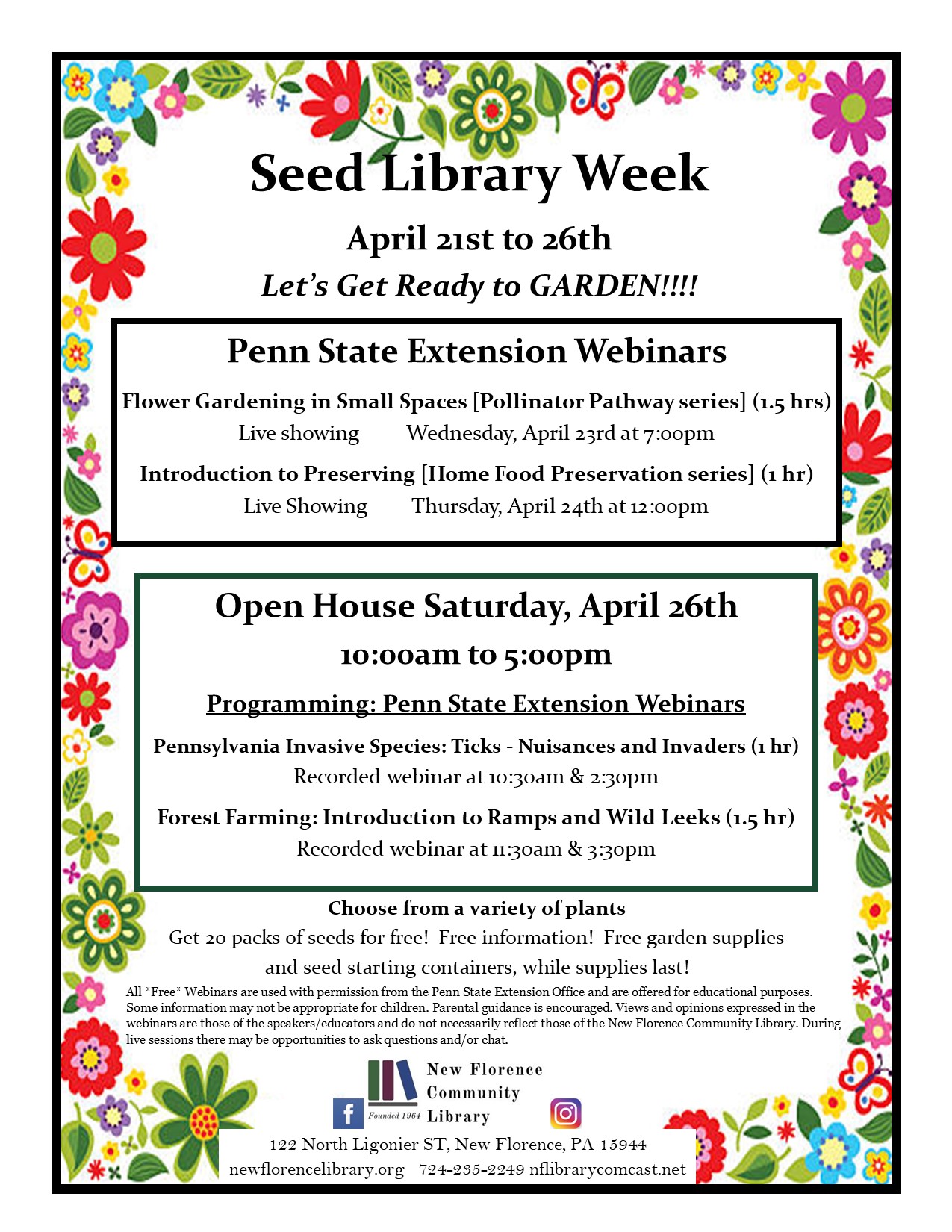 There are quite a few updates to the website. First, here is the agenda for this month’s borough council meeting. AGENDA 04-15-25 After that, the New Florence Community Library released more information on the Northwest PA Bus Trip. That information has been added to the event in the Calendar. Next, they’re hosting a Seed Library Week. Lastly, the library will be hosting 7 Penn State Extension Webinars on various topics from April 21st through June 28th. Each of these webinars has been added to the Events Calendar. The next item added is New Florence Community Days. This is a combined major event presented by both the New Florence Community Development and the Somerset Trust Company. This day is a combination of the community yard sale days and a whole series of new activities at the playground and around town. Finally, there’s a big change coming to the New Florence Family Restaurant. Connie is retiring and passing on the torch. The restaurant will be closed for about 9 days while they remodel and rebrand. Please see the flyers or check out the Events Calendar for more information on what’s going on in the borough. Thanks.