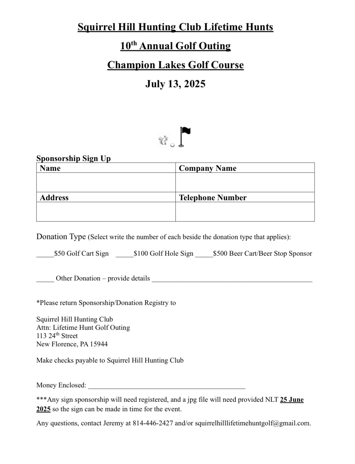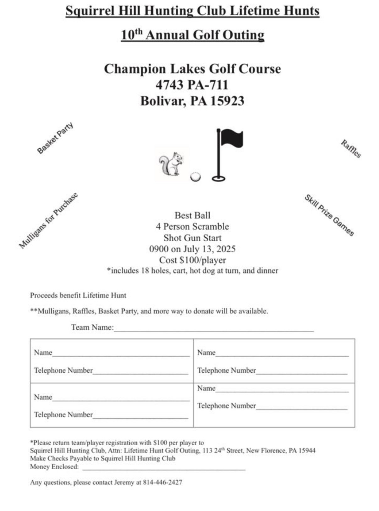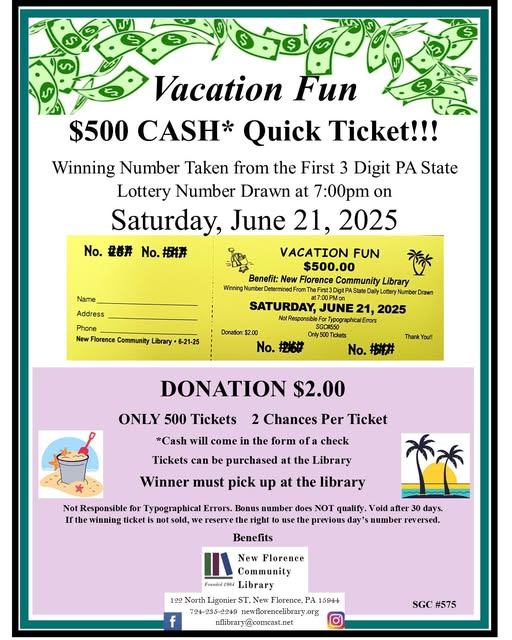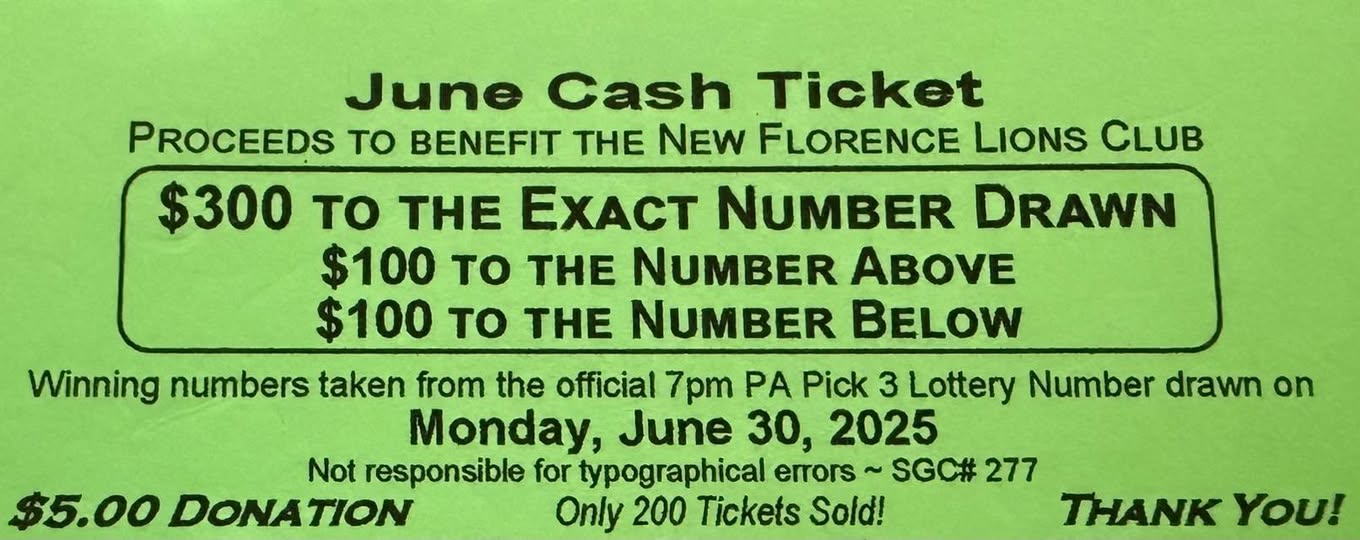 Here are some updates to the website. First, the agenda for this month’s borough council meeting has been posted. AGENDA 06-17-25 Next, the New Florence Community Development organization is selling “Summer Cash” fundraiser tickets. Please see a member to get tickets. Also, the New Florence Community Library is having their Spring Book Sale from May 22nd to June 27th. Starting Monday, June 16th, they will be having a $1 bag sale. There’s also lots of other special items available during the sale. After that, the Squirrel Hill Hunting Club would like to remind everyone of their 10th Annual Lifetime Hunt for Kids Golf Outing on July 13th, 2025, at Champion Lakes Golf Resort. Finally, please be careful outside in the evenings. Last week a black bear was caught rummaging through trash cans on 9th street in town. Keep an eye on your surroundings. Thanks all.