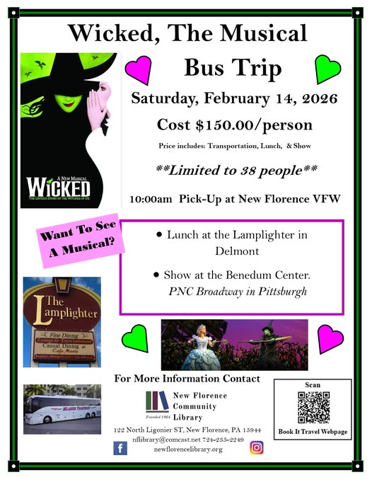 Here are a few updates for the website. First, the MINUTES 11-18-25 for last month’s borough council meeting have been added. Next, the New Florence Community Library is doing another bus trip. This trip is to go see Wicked, The Musical at the Benedum Center in Pittsburgh on Saturday, February 14th. Finally, the New Florence Volunteer Fire Department will start the new year out right with their monthly sub sale and rippie party on January 3rd. They would also like to remind folks the Santa Express will run on the 24th of December starting at 1pm. Please see the flyers below for more information. Thanks.