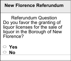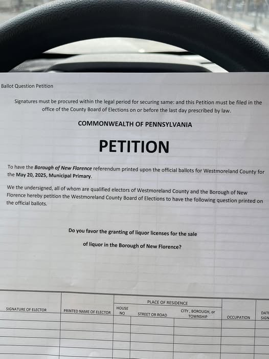 As many of you know, the Borough of New Florence is a “dry” town. No alcohol sales can occur within the borough. Over the years several attempts have been made to get this restriction overturned. Even my dad, when he and mom owned Rosie’s Restaurant, tried and did get the petition on the ballot a couple of times in the early 80’s but never got enough votes to overturn the ban. Currently, there is another group of folks trying to get this on the ballot for the next election cycle. Below is an image of the petition. Representatives will the at the New Florence Volunteer Fire Department’s sub sale on March 1st. If you believe the town should be allowed to have alcohol sales, please stop by the sub sale and sign the petition. Thanks. Greg