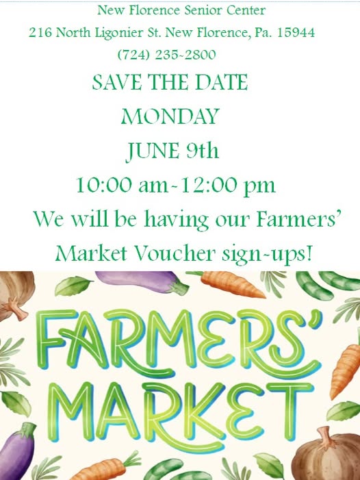 Here are some updates to the website. First, Chief Patrick M. Goggin of the St. Clair Township Police Department provided the Police Report – March 2025 for the website. Next, the New Florence Senior Center will be having their Farmers’ Market Voucher sign-up event on June 9th. Also, the New Florence Community Library is planning another bus trip for June 11th. This trip will visit quite a few unique places in northwest PA. Finally, Friday April 4th was the opening day for the Pittsburgh Pirates baseball team. Our very own Adam Gibson, Cheryl Priest’s son, led the 4-ship helicopter formation that performed the flyover for the game. On their return from Pittsburgh to Johnstown the formation went right over top of New Florence (I took the video from my mom’s back yard). It was an amazing sight to see. Please see the flyers below for more information on the events and the video of the helicopters going over the borough. Thanks.