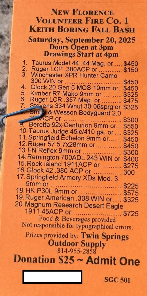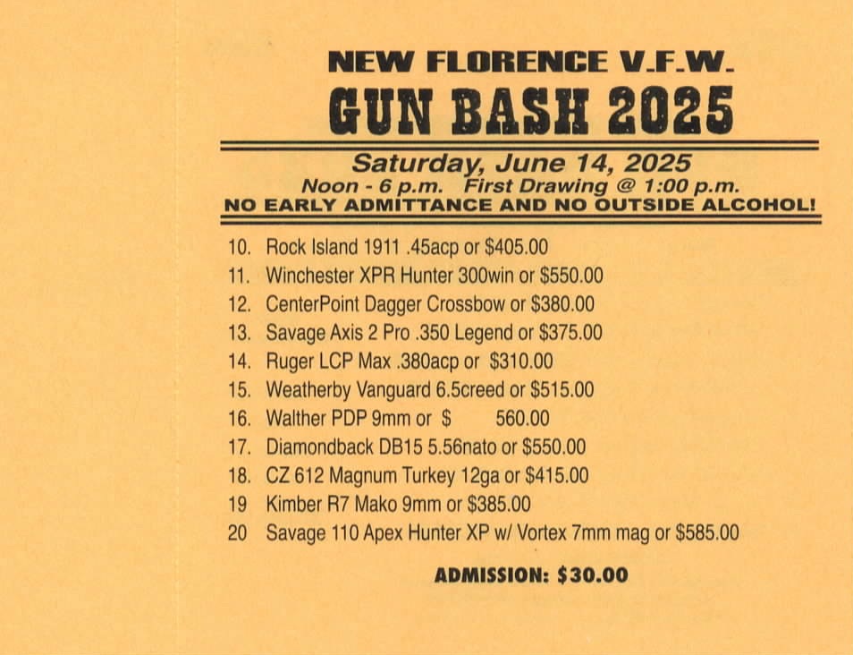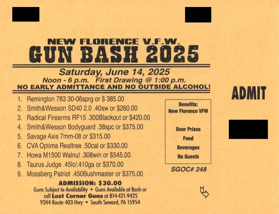 Here are some updates for the website. First, the minutes for last month’s borough council meeting have been released. MINUTES 02-18-25. Also, the New Florence VFW Post 7622 now has their Gun Bash 2025 tickets available for purchase. Images of the tickets are shown below and have been added to the event notice. Next, several changes have been made to the Residents area. On the Senior Center page, the New Florence Senior Center information has been updated. There’s a link to their monthly newsletter and menu that is very informative. Also, the GIS – Mapping System area has been updated to reflect the changes Westmoreland County made to the mapping program. Finally, the Ligonier Valley Free Museum Day has been announced as Sunday, May 4th, 2025. More information will be added as it becomes available for the free museum adventure. Thanks all.