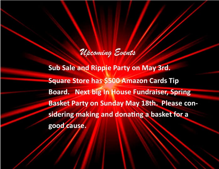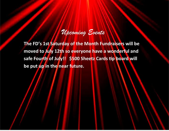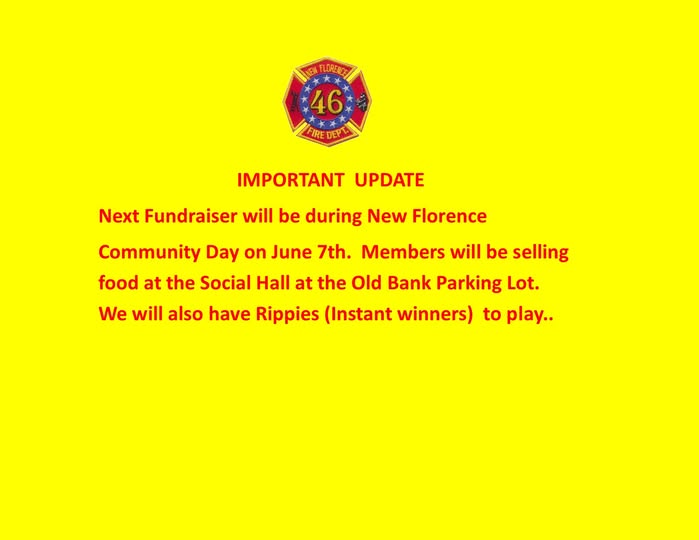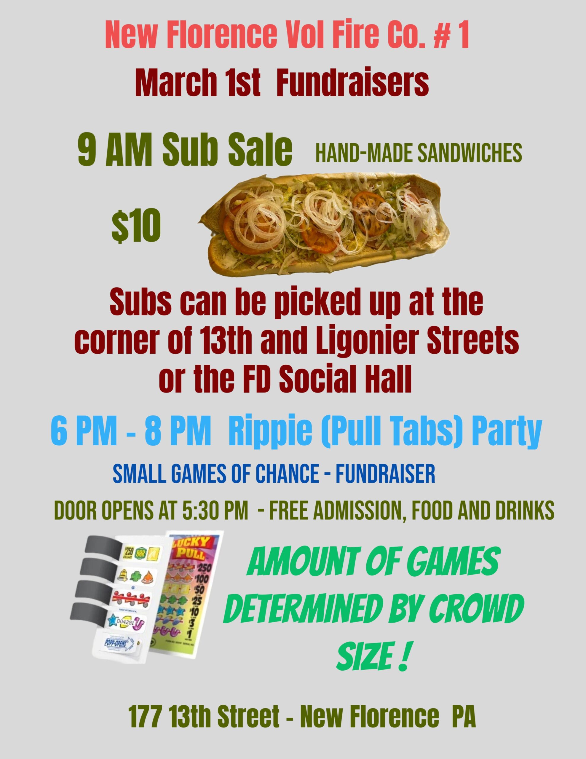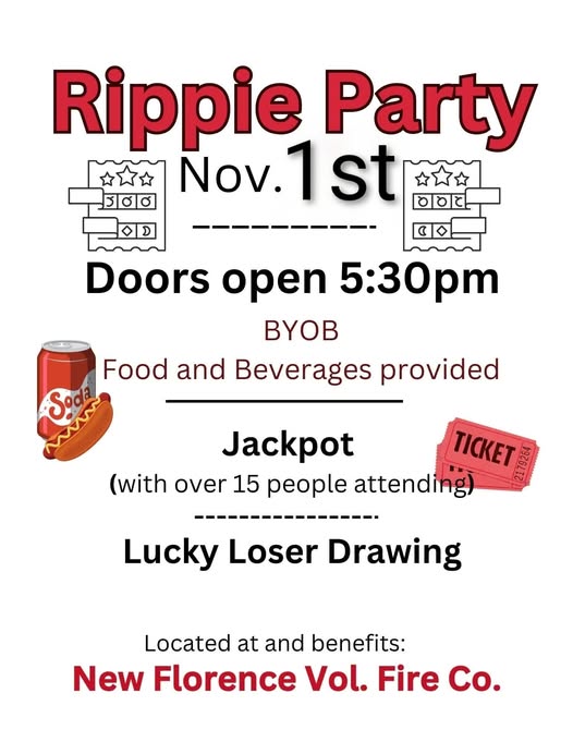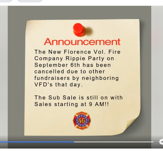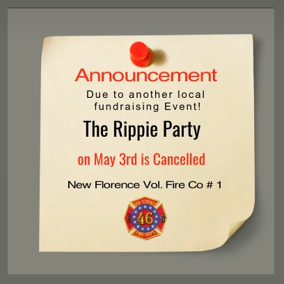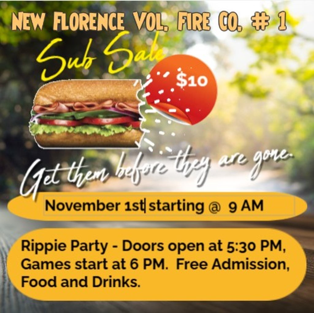 The New Florence Volunteer Fire Department cancelled this month’s rippie party due to a conflict with another fundraiser. Sorry for the short notice. However, you can always stop by Saturday morning and pick up a delicious sub. Thanks.