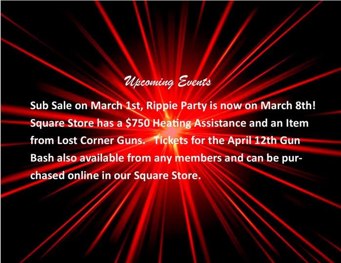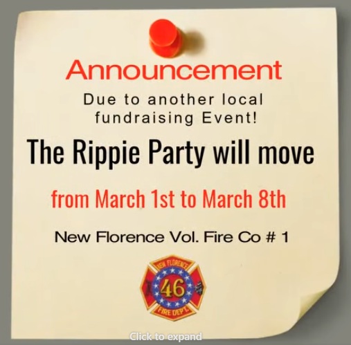 A quick date change for the New Florence Volunteer Fire Department’s rippie party. It is delayed a week to March 8th. The sub sale is still on March 1st. Cheers. Greg