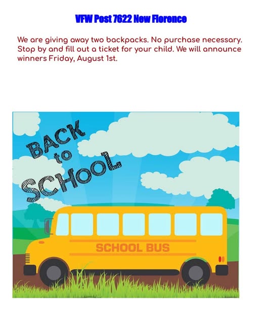 There are quite a few updates to the website. First and foremost, the June borough council meeting has been rescheduled to 30 June 2025. There were not enough members present on the 17th for a quorum. Next, the New Florence Volunteer Fire Department will be having their July sub sale and rippie party on the 12th. This is delayed a week from their normal first Saturday of the month so everyone can have a wonderful and safe Fourth of July. The New Florence VFW Post 7622 will be hosting two upcoming events. The first event is a backpack give-away to two lucky children. Please stop by the club and fill out a ticket. No purchase is necessary. The second event will be a block party on July 26th that’s open to the public. After the VFW, the New Florence Community Library has changed one of their Essential Oils workshops. The workshop will be moving from Monday June 23rd to Monday June 30th at 6:00pm for June. Finally, it’s going to be really hot this week. Please be careful. Also, check on your neighbors, especially if they’re elderly or medically compromised. Please see the flyers for more information below. Thanks.