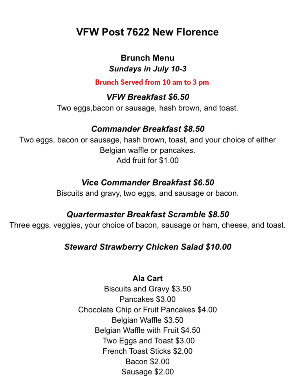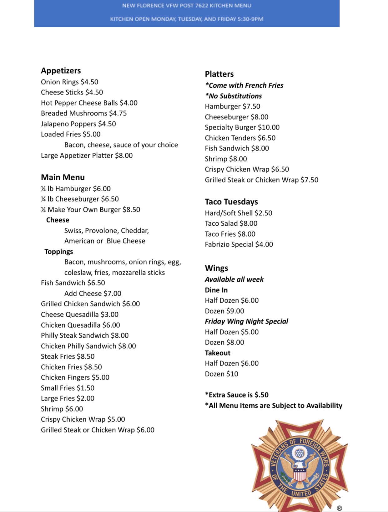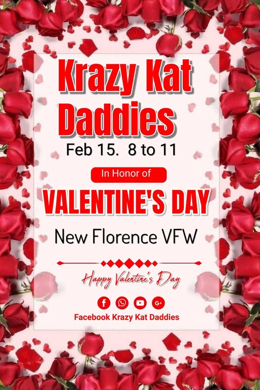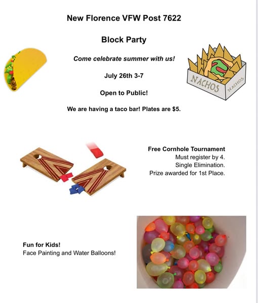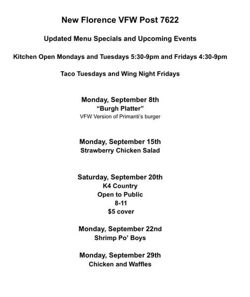 Change of plans for the New Florence VFW Post 7622. Krazy Kat Daddies cancelled so DJ Wayne will be here tonight. $5 cover. All proceeds are going towards to Adam Bills. He’s a life member that recently lost his house in a fire.