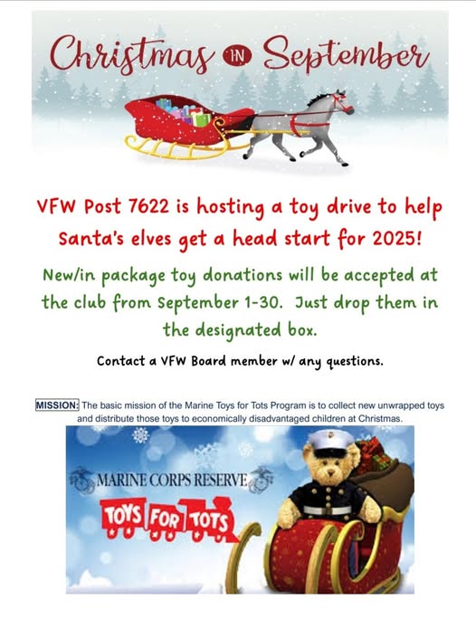 Here are a few more updates for the website. First, the New Florence VFW Post 7622 put out a flyer with September menu specials and upcoming events. Remember, the kitchen is open to the public and you don’t need to be a member of the club to come in and enjoy the food. Also, the VFW will be running a month-long Christmas in September Toy Drive in support of the Marine Corps Reserve Toys For Tots program. Please see the flyers below for more information. Next, the New Florence Community Development announced that this year’s Halloween Parade will be on Sunday, October 26th. Trick or Treat will start after the parade. Thanks all.