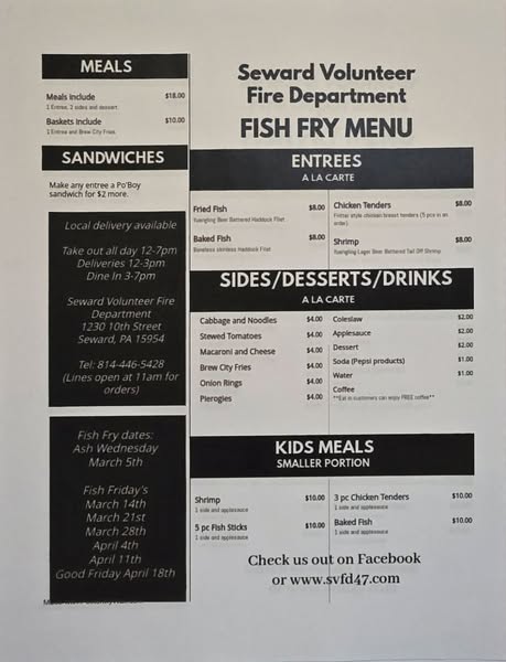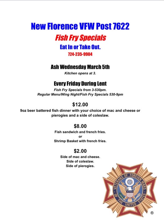 Here are several updates for the website. First, the New Florence Volunteer Fire Department will be having their next sub sale and rippie party on March 1st. They also want to remind folks the Spring Bash will be April 12th. Next, the New Florence Community Library will be having their next Literary Escape Book Club meeting on the 11th of March. Finally, Lent is almost upon us, which means Fish Fry events are just around the corner. Both the New Florence VFW Post 7622 and the Seward VFD have announced their dates and menus for their activities. Many of us older folks remember how Fish Fry events were a cherished activity growing up. Lots of us have moved away to areas that don’t have Fish Fry events. It’s a sorely missed meal. Please see all the flyers below or the event in the Calendar for more information. Thank you. Greg