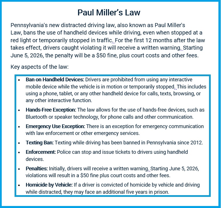 Here are a few updates to the website. The minutes for the April borough council meeting have been posted. MINUTES 04-15-25 Also, effective June 5th, a new Distracted Driving Law, known as “Paul Miller’s Law”, goes into effect. This is a new texting and driving law that bans the use of hand-held devices. Highlights of the new law are shown in the image below. Be safe everyone. Thanks.