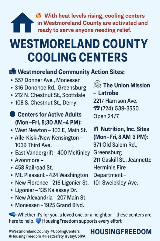 There are a few updates to the website. First, here is the updated agenda of the June 17th borough council meeting that was rescheduled to 30 June 2025. AGENDA 06-30-25 Next, the New Florence VFW Post 7622 will be serving breakfast on Sundays during the month of July. The brunch is from 10am to 3 pm. Their regular menu will also be available. As we all know, we’ve just been through a bunch of hot weather. Did you know Westmoreland C0unty operates a group of cooling centers. When the cooling centers are activated, the Senior Center on Ligonier St is one of the facilities. Finally, a big “Thank You” to all of those that helped put up the American flags along the borough streets today. They look wonderful. Please see below for more information. Thanks.