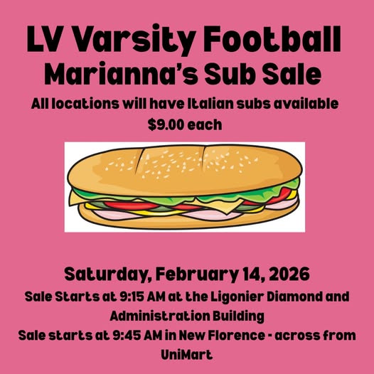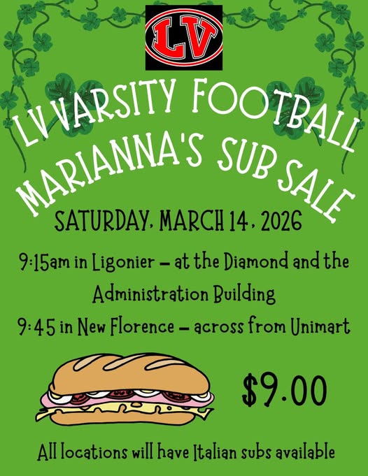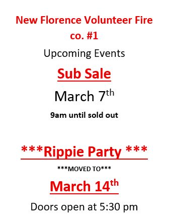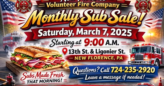 Here are some updates for the website. First, here is the AGENDA 01-20-26 for the upcoming borough council meeting. Next, the New Florence Volunteer Fire Department will have their monthly sub sale and rippie party on February 7th. Finally, the Ligonier Valley Varsity Football team will have a sub sale on Saturday, February 14th. They will be set up in New Florence at the corner of Ligonier and 13th streets. Please see the flyers below for more information. Thanks.