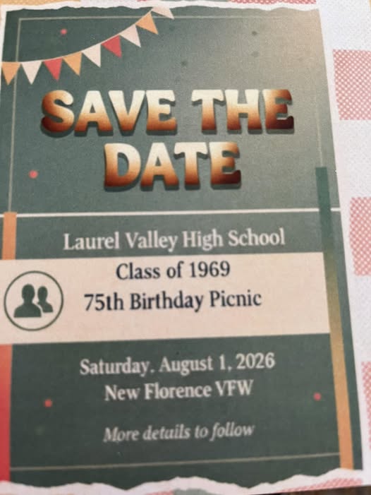Here are a couple of additions to the website. First, Chief Patrick M. Goggin of the St. Clair Township Police Department provided the Police Report – February 2026 for the website. Next, the New Florence Methodist Church is having a spaghetti dinner on April 11th from 5 pm to 7 pm. All are welcome to attend. Also, the Laurel Valley High School Class of 1969 put out a Save The Date notice for a 75th Birthday Picnic at the New Florence VFW on Saturday, August 1st. Another notice is from the New Florence Community Development organization. They’ve put out a call for vendors for the Saturday, September 26th, Craft and Vendor Event they will be hosting. Finally, Daylight Saving Time will begin Sunday, March 8, at 2 am local time in the U.S. The clocks “spring forward” by one hour, meaning sunrise and sunset will occur one hour later. DST will end the first Sunday of November, which this year will be on November 1st when clocks “fall back” by one hour. Please look at the flyers below to learn more information about all the events above. Thanks.