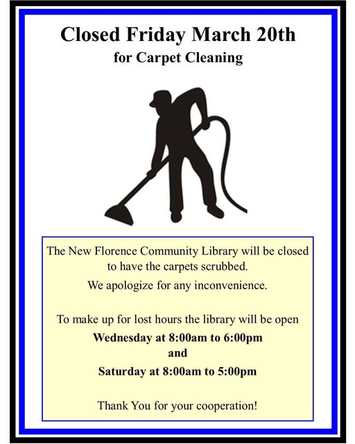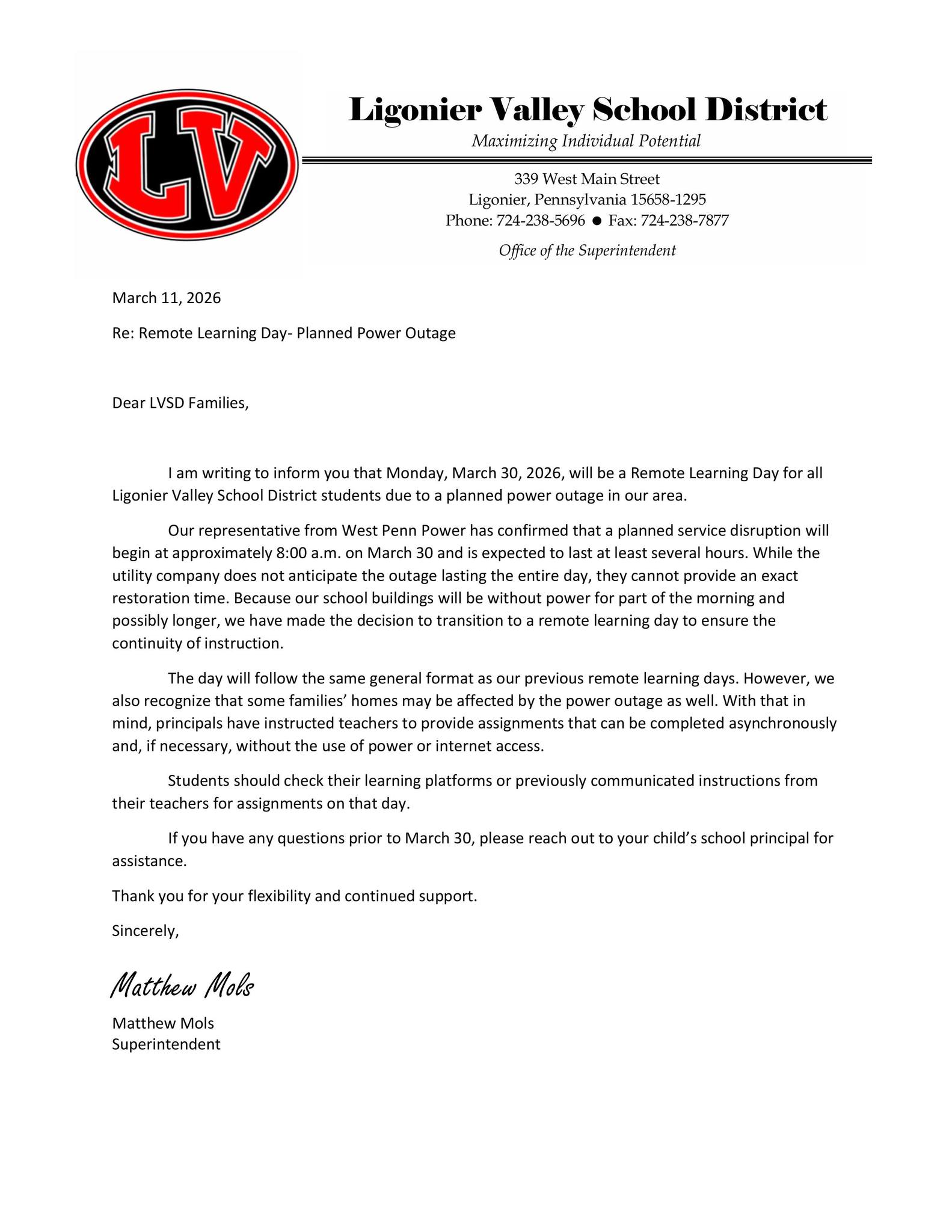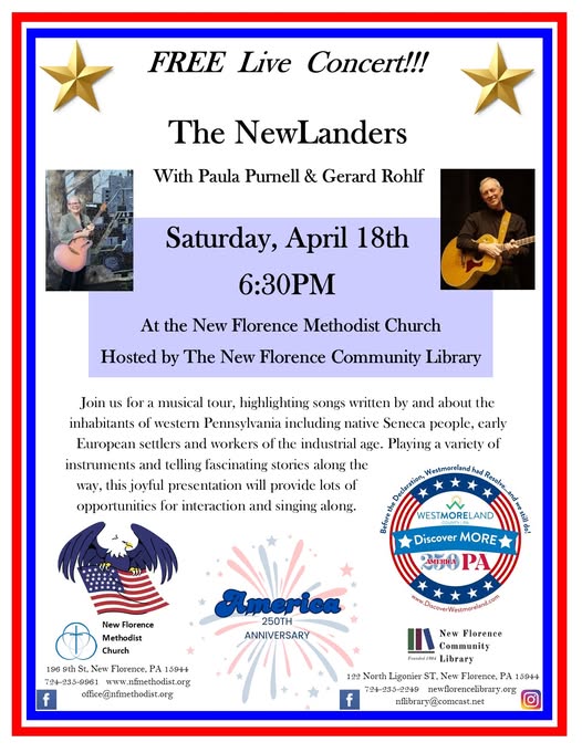 Here are just a few small updates to the website. First, the Florence Community Library will be closed on Friday, March 20th, for carpet cleaning. The library will also be hosting a free live concert featuring “The NewLanders” at the New Florence Methodist Church on Saturday, April 18th at 6:30 pm. Finally, the Ligonier Valley School District has announced that March 30th will be a Remote Learning Day due to a planned service disruption by West Penn Power. Please see the flyers and letter below for more information. Thanks.