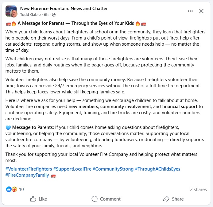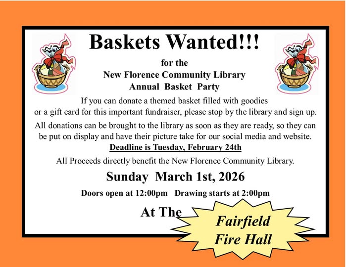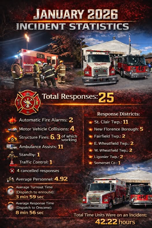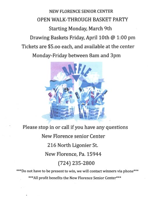 Here are quite a few additions to the website. First, Chief Patrick M. Goggin of the St. Clair Township Police Department provided the Police Report – January 2026 for the website. Next, have you ever wondered how many calls the New Florence Volunteer Fire Department makes each month? Below is a very good summary for the month of January. Also, Todd Gable of the department shared a very good message for parents and kids on firefights. It’s a well thought out Facebook post I’ve shared for others to read. The fire department also announced their Spring Gun Bash will be on Saturday, April 11th. After that the New Florence Community Development released a schedule of 2026 events in the community. Placeholders will be put on the Borough Calendar, and more information will be added as it becomes available. Finally, the New Florence Senior Center will be holding another walk-through basket party starting March 9th and running until April 10th. Please look at the flyers below to learn more information. Thanks.