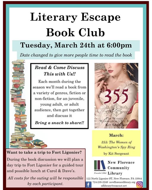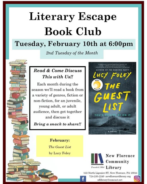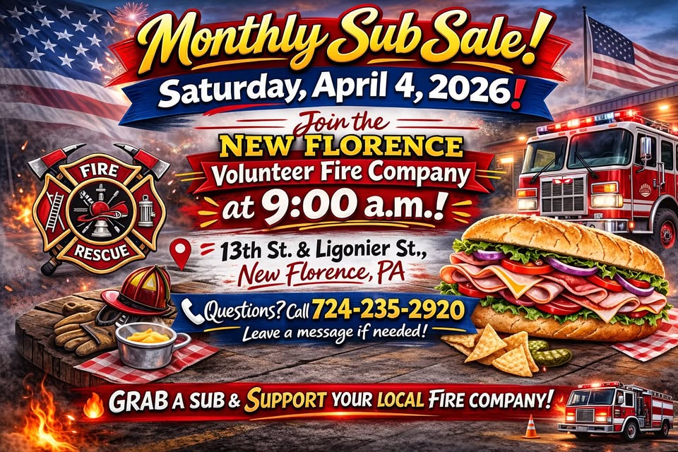 Here are quite a few additions to the website. First, Chief Patrick M. Goggin of the St. Clair Township Police Department provided the Police Report – March 2026 for the website. Next, the New Florence Volunteer Fire Department has four upcoming events. They will have their monthly sub and rippie party events on May 2nd. They are having a basket party on May 17th and then they will be hosting a spaghetti dinner on April 19th. After that, the Ligonier Valley Varsity Football team will be having another sub sale on Saturday, April 11th. Finally, the Florence Community Library will be hosting their Literary Escape Book Club meeting on Tuesday, April 14th at 6 pm. The library also has a Welcome Summer $500 CASH Quick Ticket fundraiser that goes off on Saturday, May 9th. Please see the flyers below or the Calendar for more information. Thanks.
