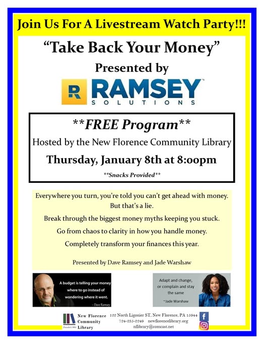 Here are a couple of updates for the website. The New Florence Community Library is holding a livestream watch party on January 8th. This is a free program presented by Ramsey Solutions on “Take Back Your Money”. Have you ever been to the New Florence Senior Center? They do a lot of fun activities for the community and now, the center has T-Shirts for sale for only $10. That’s a great deal and they have a cool logo. Please stop in and pick one up. Finally, it’s wintertime and we’ve had storms and bad winds in the area already. Many folks have lost power for an extended period of time. FirstEnergy recommends everyone have an emergency kit for just such situations. Please see the flyers and photos below for more information. Thanks.