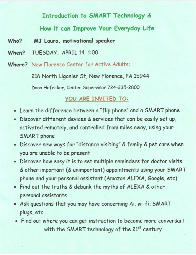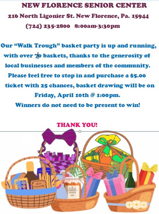 Here are some additions to the website. First, here is the AGENDA 03-17-26 for this month’s borough council meeting. Then, the New Florence Senior Center put out an updated flyer for their walk-through basket party running until April 10th. The center is also hosting a workshop for seniors on Introduction to SMART Technology. Next, the Florence Community Library is raffling off gardening supplies as a fundraiser. The winning ticket will be drawn on April 25th at 4 pm. Chances are $1 each or 3 for $2. The proceeds will benefit the seed library and flower beds around the library. Also, the New Florence VFW Post 7622 will be having an Easter Egg Hunt on April 4th. Finally, the borough announced lawn waste pickup will resume for the season. Pickup will be on Tuesdays weather permitting. All lawn waste must be brought to the curb, grass and leaves bagged, and no limbs over 4” inches diameter. Absolutely zero trash will be taken. If you have questions, feel free to call the borough office at 724-235-2000. Please see the flyers below for more information. Thanks.