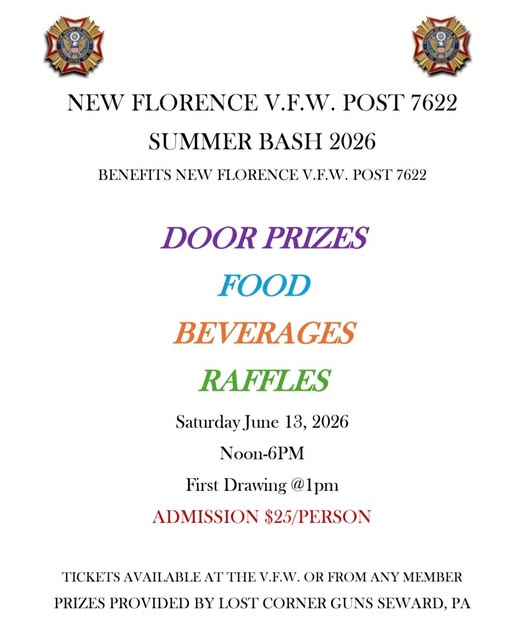 Here are a bunch of updates for the website. First, here is the AGENDA 04-21-26 for April’s borough council meeting. Next, the New Florence Volunteer Fire Department has several upcoming events. They want to remind folks of the Adult Bingo and Drag Queens event on May 1st. They are also having a Blessing of the Bikes on June 20th for all the motorcycle riders in the area. The fire department also announced they’ll be hosting a farmers market this season starting on June 13th. Finally, considering the bicycle/motor vehicle accident recently in the borough they’ve put out a Bicycle Safety Awareness notice. Please remind your kids to be safe. Next, this is seed week at the Florence Community Library. There will be daily webinars from Penn State Extension Office. You can also take a chance on a large collection of gardening supplies they are raffling off. Finally, the New Florence VFW Post 7622 announced they are doing a bus trip to Washington DC on June 4th. One of the planned stops is Arlington Cemetery which is an amazing and solemn place highlighting the ultimate sacrifice warriors have made serving this great country. Please see the flyers below or the Calendar for more information. Thanks.