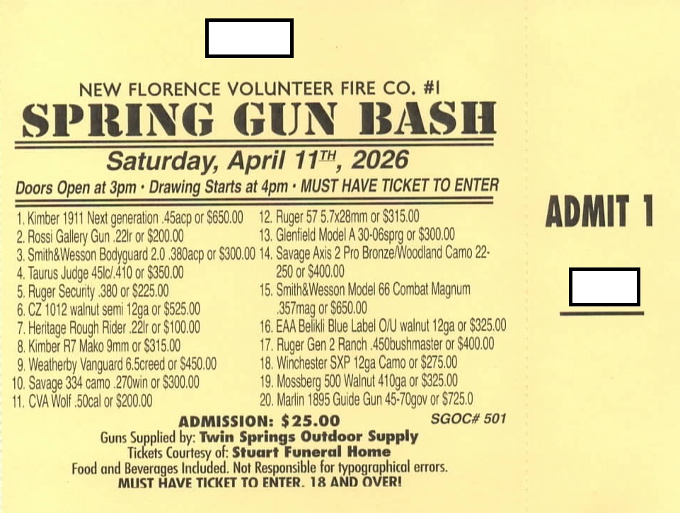 Here are several additions to the website. First, here is the MINUTES 01-20-26 from last month’s borough council meeting. Next, the Florence Community Library will be having another Literary Escape Book Club meeting on March 24th. The library also just got in the IRS 1040 instruction booklets, 1040 forms, 1040-SR Forms, and Schedule 1-A forms. Stop by anytime the library’s open for your IRS 1040 forms and instructions while supplies last. Also, below is an image of the gun bash ticket for the New Florence Volunteer Fire Department’s event on Saturday, April 11th. The fire department is also dropping their fundraiser specific Facebook page on 30 April 2026. The fire department would also like residents to know they operate a warming center when needed at the fire hall. Contact information is shown below for those in need. Finally, with it being Lent, many organizations have fish fry fundraisers. The New Florence VFW Post 7622 will be serving fish dinners and fish sandwich specials during Lent. Please look at the flyers below to learn more information. Thanks.