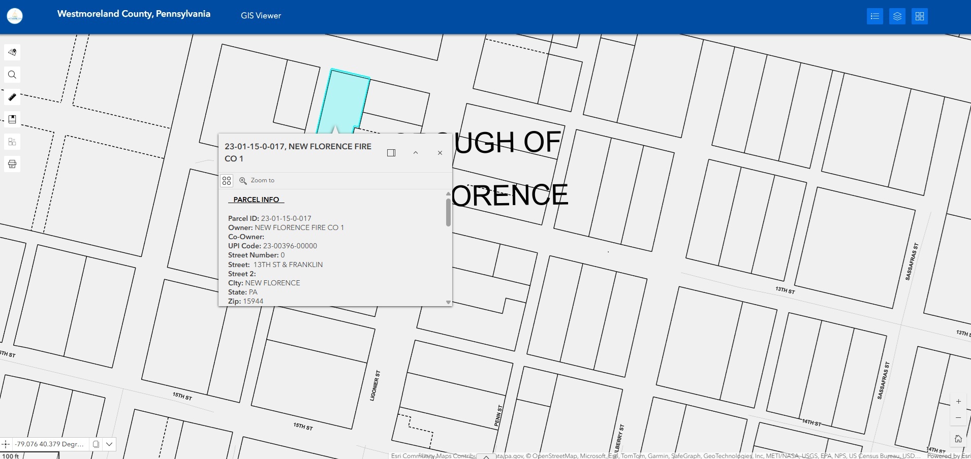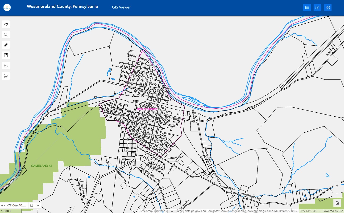 The Westmoreland County Geographic Information Systems (GIS) is a mapping application used by the county. It fulfills a statutory requirement that all taxable property be mapped. It is a vital tool in the tax assessment process. The main GIS page can be found at GIS. Besides access to the tax mapping site there is a very interesting section on Historic Maps and Resources. There is also a basic help section on how to use the tax mapping site and another section on how to print out various portions of the tax maps. The mapping application can be accessed by clicking the “Tax Mapping Site” link in the blue menu box on the left side of the page. Before reaching the maps you will be directed to the Tax Mapping Site Disclaimer first. Click the Accept link at the bottom and you’ll continue to the maps.