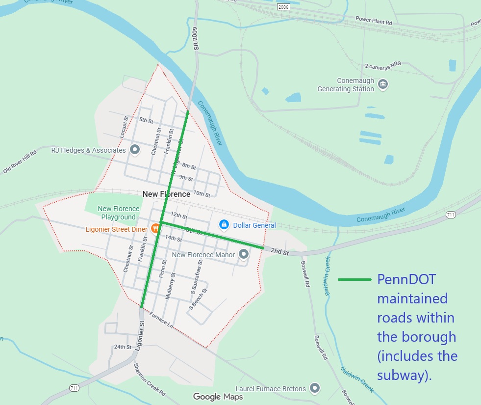 The borough office receives a lot of complaints about the condition of Rt 711, Rt 1001, and the underpass for those driving in the borough. These primary roads into and out of New Florence are state roads. These roads are more commonly known as Ligonier Street going from the bridge over the Conemaugh River to the intersection with Furnace Lane near the top of town hill. The other section is 13th Street from Ligonier Street to the New Florence VFW. These roads are not maintained by the borough; however, the storm drains under the roads are the borough’s responsibility. The diagram below shows the roads within the borough that are state maintained.