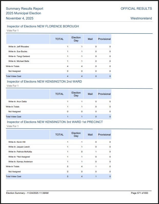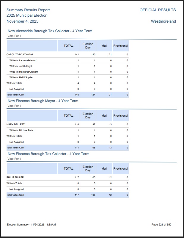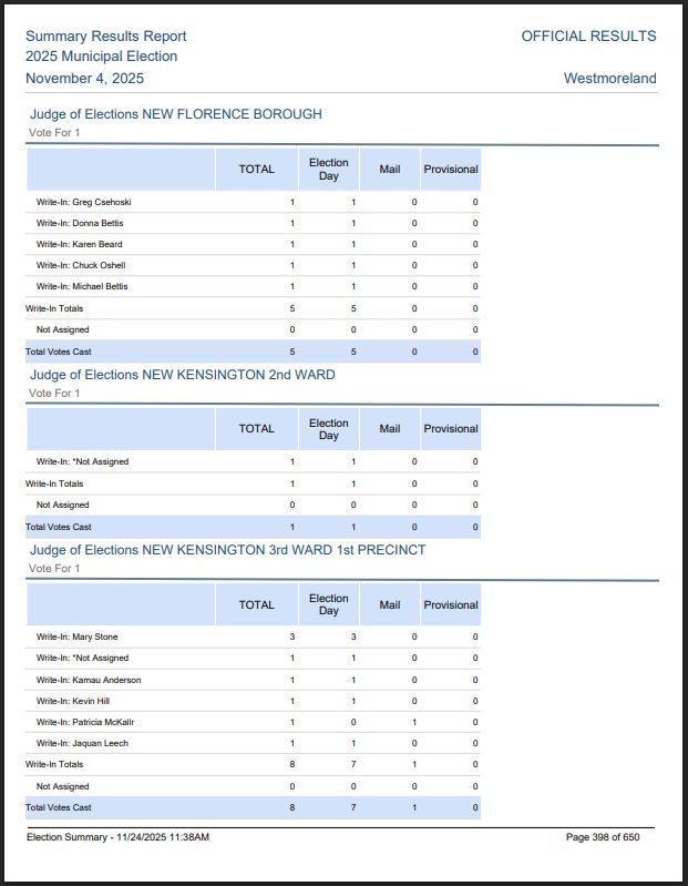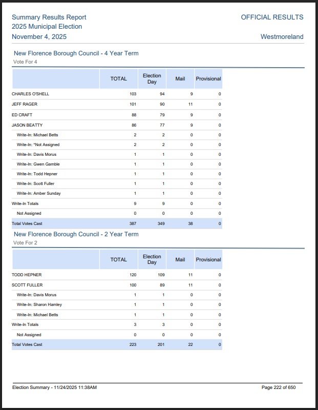 Westmoreland County New Florence Voting PREC REPORT November 2019